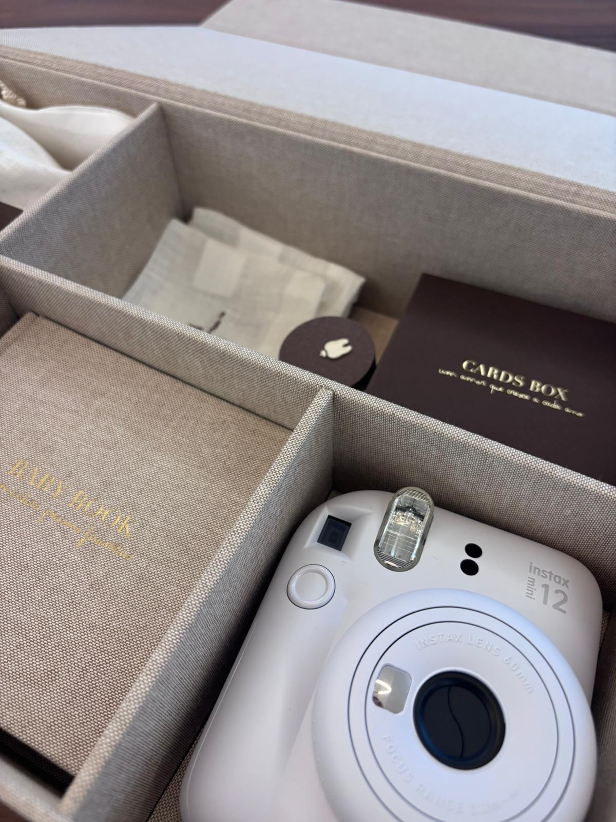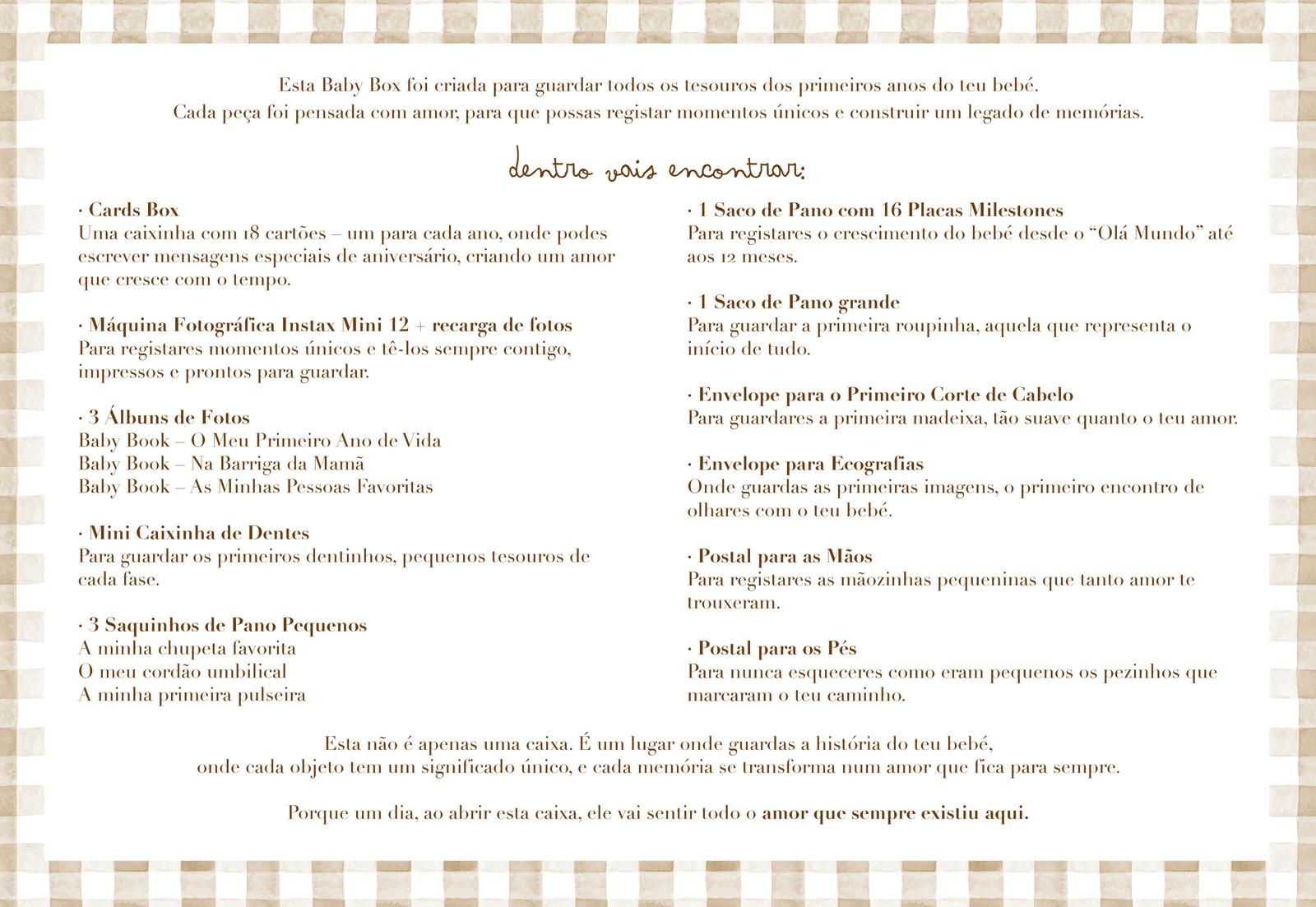 Esta Baby Box foi criada para guardar todos os tesouros dos primeiros anos do teu bebé. Cada peça foi pensada com amor, para que possas registar momentos únicos e construir um legado de memórias que um dia ele vai abrir, sorrir e sentir todo o teu carinho.